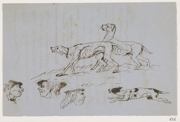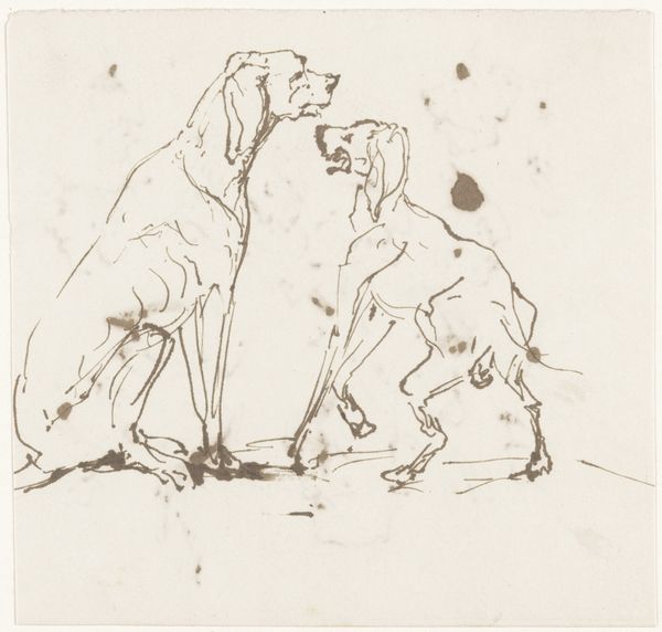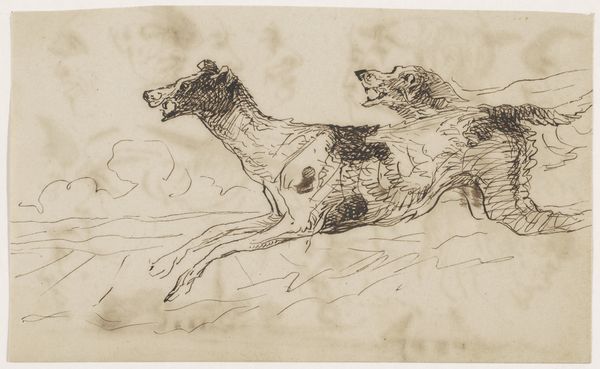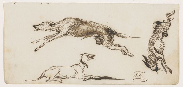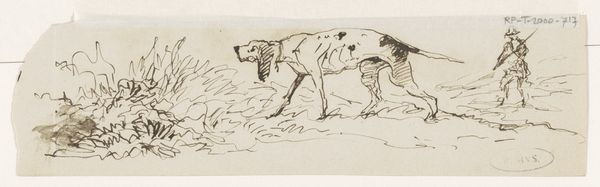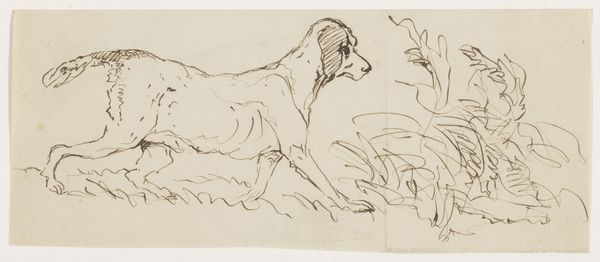 Johannes Tavenraat made this hunting dog with bird in its mouth with pen in brown ink on paper in the 19th Century. The quick, gestural strokes of the pen give the image a sense of spontaneity, capturing a fleeting moment in the hunt. The artist's hand is evident in the varying line weights and the textures created through hatching and cross-hatching. The choice of brown ink lends a warmth to the scene, contrasting with the starkness of black ink, and perhaps suggesting the earthy tones of the hunting environment. It reminds us that drawing, often seen as a preliminary medium, possesses its own inherent qualities, with a direct connection to the artist's hand and mind. This piece challenges us to consider the value of works on paper, often overshadowed by grander paintings, as significant expressions of artistic skill and vision.