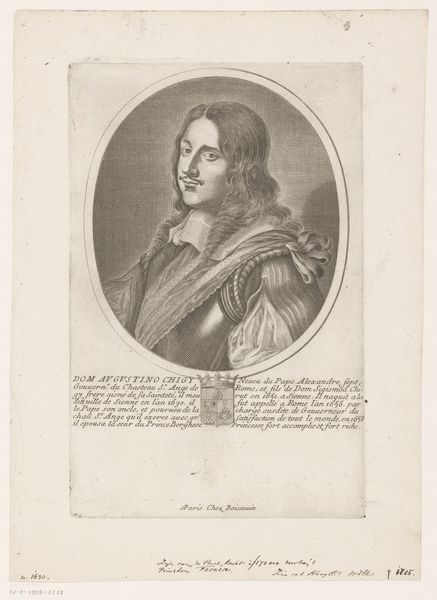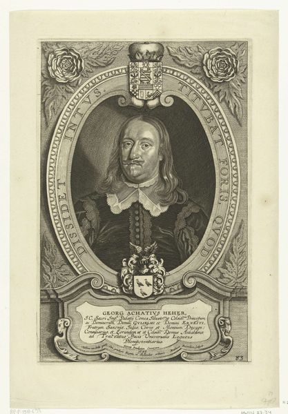 Curator: Here we have Conrad Meyer's "Portret van Johann Kambli," created in 1674. It's an engraving, a print. Look closely at the way he rendered the texture of the clothing with such precise lines. Editor: It has such a stoic air! Very serious, though almost a dreamlike quality permeates this engraved image. Curator: Yes, the weight of social expectation is literally etched into the plate! Engravings like this involved intense labor, both in the design and the cutting of the lines. This wasn't just artistic expression; it was skilled craftsmanship meant for mass production, in a sense. Prints like this spread Kambli’s image around his community. Editor: I suppose the detail comes from that craftsmanship, yes. Those fine lines capture everything from the glint of his jewelry to the slight furrow of his brow... all these little precise marks add up to, somehow, reveal so much. He’s posed heroically—an interesting contradiction with the medium, almost. What a task—almost Sisyphean—to etch that with your hand! Curator: Think of the networks involved! Paper production, ink, the printing press itself, and the distribution networks necessary for prints to circulate! These material elements underpin the circulation of knowledge and status during that era. It represents not only artistry but industrial development, reflecting a market where status and recognition were literally reproduced and circulated as a commodity. Editor: Maybe it’s knowing how much intense labour went into this particular form, but there is a profound humanness to it, like a meditation of hands, eyes, the paper, and its future… It adds such complexity of presence. And the writing—is that Latin, German? Curator: Yes, both! The Latin phrases above and below the oval frame translate roughly to "For God and Fatherland," and "Not in Vain," hinting at his public service, as Landammann of Glarus, a high administrative role. The other lines provide context that reinforce and affirm his identity. Editor: It gives you chills—knowing a little something about the hands and machines behind it! I keep noticing that tension between art and industry. Almost tragic. Curator: It highlights art's position within larger systems, doesn't it? Editor: Absolutely! Curator: Precisely. It allows a unique glimpse into the tangible conditions that shaped his life. Editor: Absolutely! It stays with you somehow.