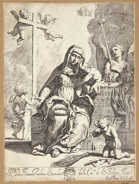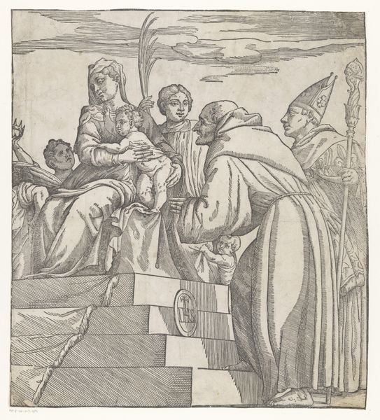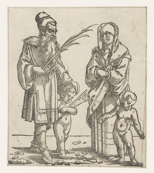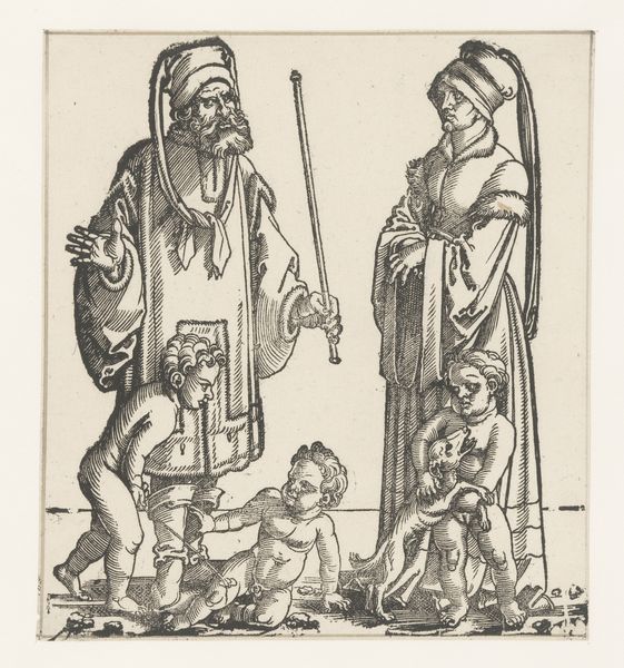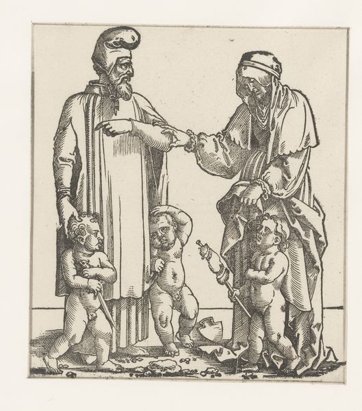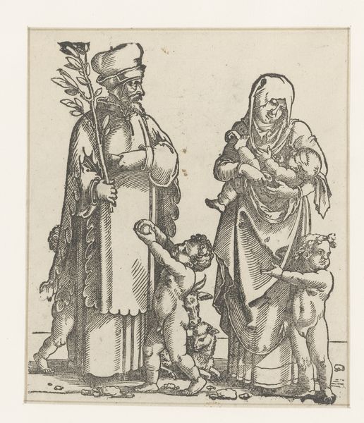 Curator: This engraving, crafted around 1530 by an anonymous artist, is titled "Henoch met zijn vrouw en kinderen"—Enoch with his wife and children. It resides here at the Rijksmuseum. What are your initial thoughts? Editor: It's remarkably lively, especially for an engraving of that era. The figures of the children have such a tactile quality. There's an almost chaotic energy despite the somber expressions of the adults. Curator: Absolutely. Consider the role of family portraits within the social and religious contexts of the Northern Renaissance. Works like this weren’t simply domestic scenes; they actively communicated a family's identity and status in the world, and especially their place in the religious world. Editor: It does seem intent on portraying a righteous, God-fearing family, doesn't it? Yet there’s this sense of contained anxiety that ripples through it. I wonder how intentional that contrast might be? And who this Henoch was meant to represent at the time? Curator: The Old Testament figure Enoch was indeed a patriarchal exemplar. Now, think about the politics of image making in the 16th century, particularly within domestic spaces. Who had access to this engraving? How would its presence in the home shape societal notions around family piety? And how are women represented? The mother here looks less joyous. Editor: Exactly! There’s a definite separation—almost an imposed one—between her role as a caregiver and her husband’s presumed authority and connection to the divine. The weight of societal expectation seems visually embedded in her form, wouldn't you say? Curator: It underscores the prevailing patriarchal norms where women are defined almost exclusively within domestic roles and the reproduction of the family line. That these roles are portrayed with so much care is part of the dynamic the piece invites to interpretation. Editor: And it prompts a discussion about the artwork’s original viewer—whose perspective are we meant to adopt? It leaves me pondering the lived experiences of women during this time period, so drastically different, yet, on a patriarchal level, perhaps, also connected to current power structures. Curator: Exactly. By understanding these power dynamics, and their visual representation at the time, we can appreciate the print as both an object reflecting a specific culture and historical moment, but also, importantly, we get a view of ourselves. Editor: An exercise in perspective—both backward and forward. Fascinating!