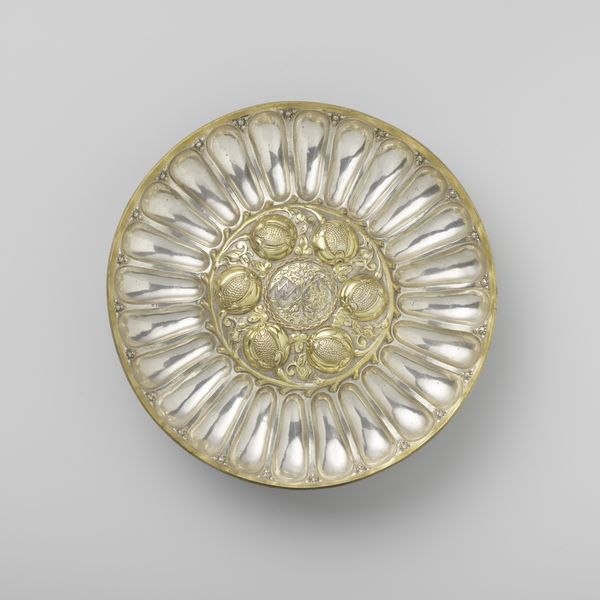 Editor: This is an octagonal dish made of silver relief by Master P.M., dating back to 1645-1655. Its intricate detailing and baroque style give it a regal and refined mood. What do you see in this piece beyond just a pretty plate? Curator: More than a plate, it's a mirror reflecting a society’s values. The octagonal shape itself, departing from the typical circular form, is intriguing. Numbers have always carried symbolic weight. Eight, often associated with regeneration or infinity. The repetition of floral motifs bordering the central space speaks of a cultivated appreciation for beauty and perhaps the bounty of the earth. These emblems would have been instantly recognizable to its intended audience. What kind of stories might it tell, do you think? Editor: That's fascinating. I guess I was just looking at it as an object. Knowing there's a symbolic language at play makes me wonder what kind of gatherings or rituals it would have been part of. Were certain flowers more significant than others? Curator: Precisely! While identifying each flower is challenging without closer inspection, consider the fleur-de-lis. Have you encountered it elsewhere? Editor: Definitely. It’s all over French royal imagery. I didn't even notice that detail! Curator: Its presence indicates possible connections to power, nobility, and established authority. The object transcends mere functionality to become a symbol laden with social and cultural implications. Editor: That completely shifts my perception of it. I was drawn in by its beauty, but understanding the iconography behind the artistry is way more meaningful. Curator: Indeed. Everyday objects are always cultural vessels. Engaging with them critically, unlocks those rich layers. What would you look for, next time?