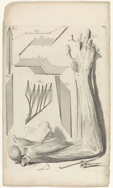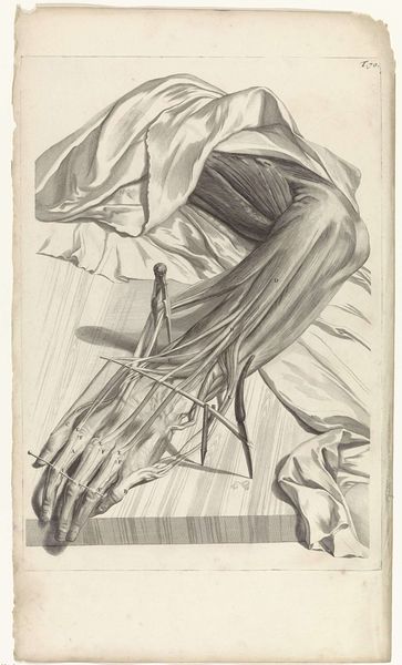 Curator: Here at the Rijksmuseum, we have Pieter van Gunst’s 1685 anatomical study of the right foot and toes rendered as an etching. What strikes you about it? Editor: It’s unsettling and beautiful simultaneously, isn't it? The precision with which the muscles and tendons are depicted gives it a scientific air, but the lack of skin or blood feels surreal. I keep wondering, what are feet, really, beyond how we see them and use them everyday? Curator: The etching exemplifies academic art traditions of its time. Such meticulous renderings weren’t just about biological accuracy; they were steeped in symbolic ideas about the human form as a mirror of the divine. You see echoes of form meeting spirit here, particularly from the Renaissance on. Editor: Definitely. The arrangement has that Renaissance touch. What I find striking is this dance between detached observation and underlying... intimacy? Like staring at a ghost of physicality. Curator: Think about the visual language, though. Line and form become philosophical tools here, almost transcending mere anatomy. The foot becomes a history-painting of sorts, speaking volumes on how we perceive reality. Even something as commonplace as feet. Editor: True. It makes me think of societal perceptions, too. Feet are so often hidden, considered unattractive—but here, they’re laid bare, both literally and figuratively. This takes feet out of the realm of mere function. It becomes something profound, stripped back to raw essentials. Did viewers back then respond the same? Curator: No doubt it challenged their preconceived notions. Images like these, distributed widely through printmaking, altered our perception of the physical self in tandem with nascent medical science. Remember, feet carried specific, gendered cultural weight: foot binding in certain societies, barefoot humility, the heroic "foot soldier". Each of these symbols had cultural currency. Editor: I'm finding my own continuity from these renderings to our medical diagrams today; they hold something universally human—both a fear of our physical selves and fascination. It's all in our stride! Curator: Absolutely, this image captures human duality! The rational dissecting gaze mixed with our emotional and perhaps psychological discomfort at seeing ourselves inside and out. I find the etching reminds me of cultural obsession that runs from folklore all the way through the halls of science. Editor: The kind of obsession that helps you question...what you really stand for? Okay, no more foot puns, I promise! Thanks for this intriguing conversation.