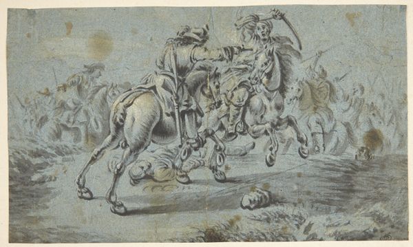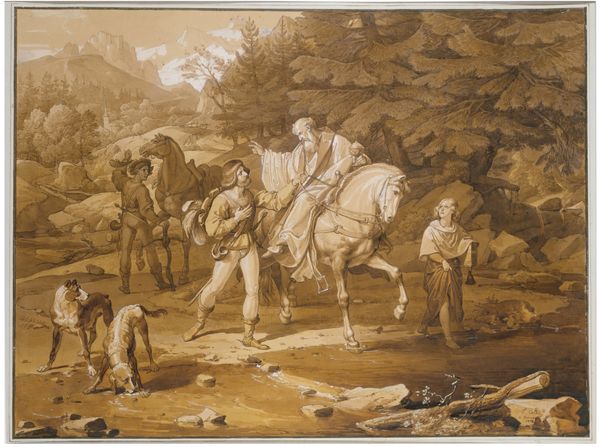 Editor: So, here we have "Hunter on Horseback" created in 1566, attributed to Nicolò Boldrini. It's a print, done with etching, I believe. It has this kind of melancholic feel to it, almost like the hunter’s returning not entirely successful. What do you see in this piece? Curator: Oh, I feel that melancholic homecoming too, almost a poetic fatigue etched into the landscape and the very posture of the horse. Boldrini, you know, was working in the long shadow of Titian. I imagine he was deeply inspired by Titian's landscape painting. Have you noticed how the landscape is not just a backdrop but almost another character in the narrative? Editor: I can see that now, yes, it's not just decoration. There’s this merging of man, beast and nature. Were there many genre scenes like this at the time? Curator: Interesting that you mention genre, because in 1566 "genre-painting" hadn't really been defined as such, though of course elements of everyday life often found their way into paintings. This to me feels very particular to its moment, a transitional phase between purely allegorical scenes and everyday representation. Look at the almost fussy detail on the horse’s mane, but then a stark and strangely modern composition in the positioning of the hunter. Don't you find the way the scene is set very intriguing? Editor: I do, the details versus the starkness. I hadn't quite appreciated how those details create a whole world until you mentioned that the landscape is like a character itself. Curator: Absolutely! I think these tensions and intricacies that capture our imagination are Boldrini’s real skill and talent as an artist! It offers, in a way, a quiet contemplation on our place within the natural world, which resonates even today.