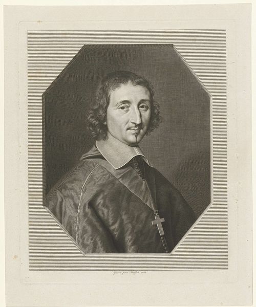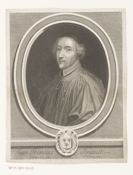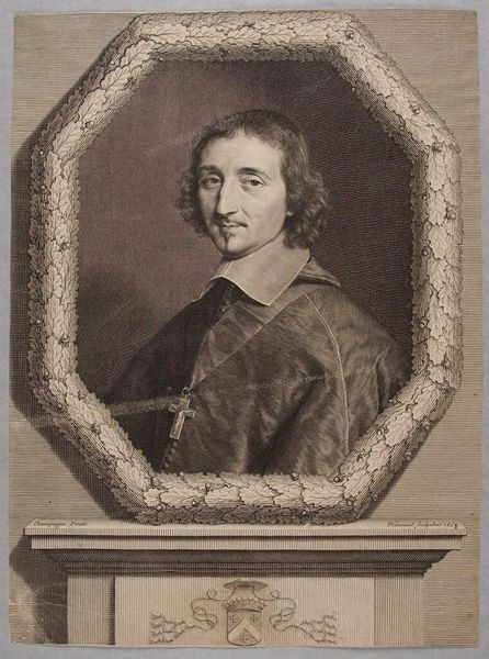 Editor: This is "Ferdinand de Neufville," a print by Robert Nanteuil from 1658. It's quite a formal portrait, rendered meticulously in engraving. It has a very composed mood. I am struck by the frame surrounding the subject; it gives it the feel of official portraiture. What do you think about this piece? Curator: It's fascinating how Nanteuil uses the print medium to convey status and power in 17th-century France. Prints like this were crucial for disseminating images of important figures across society, shaping public perception. Think about it – before photography, how else would people visualize their leaders? Editor: So, these weren't just aesthetic objects, but almost a form of propaganda? Curator: Exactly! Consider the symbols: the ornate frame, the sitter’s attire signifying religious authority. Everything is carefully constructed to project a certain image, and this print, multiplied and distributed, reinforced that image within the social fabric. The sitter must have commissioned this to assert his identity within the social and political sphere. Do you agree? Editor: That makes a lot of sense. The level of detail does seem intended to impress. Also, I did not think about it being a reproduction shared in multiples and influencing public perception. Curator: Yes, it's less about individual artistic expression here, and more about the role of the image in a broader social and political context. Think of it as an early form of political branding! Editor: This has reshaped how I viewed the role of printed portraits in baroque era; it makes one consider power structures. Curator: Absolutely. It’s a reminder that art is always intertwined with the social forces of its time, even a seemingly straightforward portrait like this.