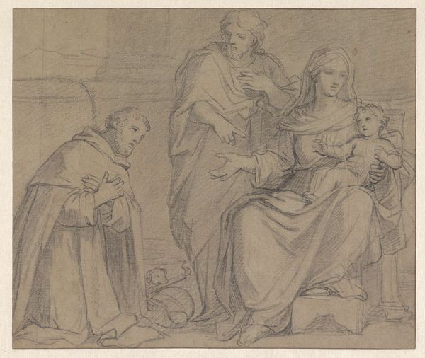 Editor: This is "Cornelia, Mother of the Gracchi, Pointing to her Children as her Most Precious Ornaments," a drawing from around 1548-1598 by Gillis Mostaert the Elder. It's done with ink and charcoal on paper. The composition seems pretty formal and staged, almost like a tableau. What strikes you most about it? Curator: What I notice immediately is the process. It's a drawing, an inherently reproducible medium given its ease of transfer via prints. Think about that choice in relation to its subject: Cornelia, rejecting material wealth – jewelry – for the "wealth" of her children. The work, itself easily reproduced, comments on forms of wealth, tangible versus intangible, accessible versus exclusive. Editor: So you're saying the medium itself contributes to the meaning? How so? Curator: Precisely. Consider the economic and social context. The printing press allowed for wider distribution of images, thereby democratizing art in a way previously impossible. Does Mostaert critique the aristocratic hoarding of treasure by glorifying a mother’s virtue with tools of mass production? How does the labor of making a drawing, inherently replicable through prints, contrast with the labor required to acquire the jewels Cornelia rejects? Editor: That’s fascinating. I never thought about the connection between the printing process and the statement about wealth. Curator: The deliberate choice of materials -- ink, charcoal, paper – highlights this tension between value and accessibility. They were readily available, and prints could easily spread this story of supposed virtuous behavior widely to a burgeoning middle class. So, how does this knowledge influence your understanding of the piece now? Editor: It shifts my perspective completely. I was initially focused on the classical scene, but understanding the process makes the work a social commentary, which brings more depth. Curator: Exactly! Examining materiality allows us to reconsider assumptions and explore underlying power dynamics. Editor: That is helpful; I learned to question artistic intention by analyzing how and why a work was made!