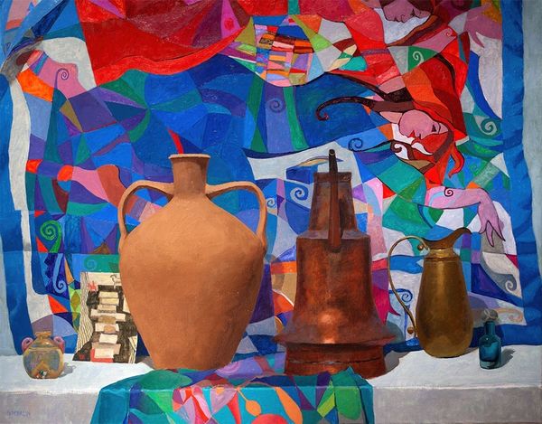Melissa Hefferlin made this still life painting, "The Heart's a Deep Well," using oil on canvas. Here, ordinary items are given careful attention. Look at the copper jug, for example. Its form is carefully built up with layers of paint, capturing the metal's warmth and the marks of its making. Next to it is a glass vase and a light bulb. The contrast between the crafted copper and the manufactured glass is striking. Even the textiles draped in the background hint at a world of labor and trade. This combination of domestic objects invites us to reflect on the everyday. Hefferlin prompts us to see the beauty in the mundane, elevating these objects through her artistic process. By looking closely at the materials and craftsmanship involved, we can appreciate the social and cultural significance embedded within this seemingly simple scene. It invites us to reconsider the value we place on the handmade versus the mass-produced, the artistic versus the functional.