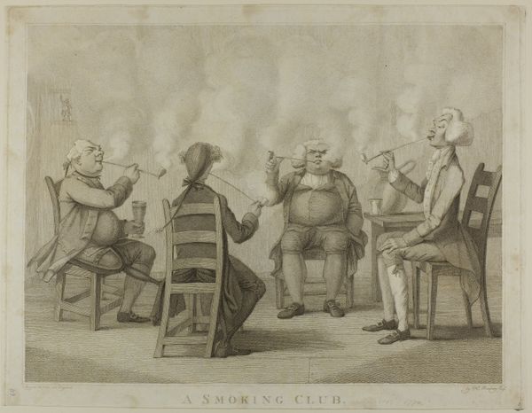 Henry William Bunbury made this print called "The Sulky Club" using etching and engraving techniques. The image depicts a group of men, each radiating a distinct air of displeasure and social disengagement. Made in England, it subtly critiques the social dynamics of the late 18th century. These clubs emerged as spaces for men of leisure and influence, shaping public opinion and cementing social hierarchies. The figures' exaggerated expressions and postures suggest a satire of this environment. Bunbury, in this print, questions the idealized image of the gentleman and the role of social clubs in reinforcing class distinctions. To further understand Bunbury’s criticism, we might look into records of these clubs, and explore the period’s political cartoons and social commentaries. Through historical research, we gain insights into the meaning of art as something contingent on social and institutional contexts.