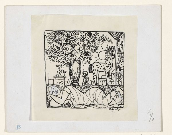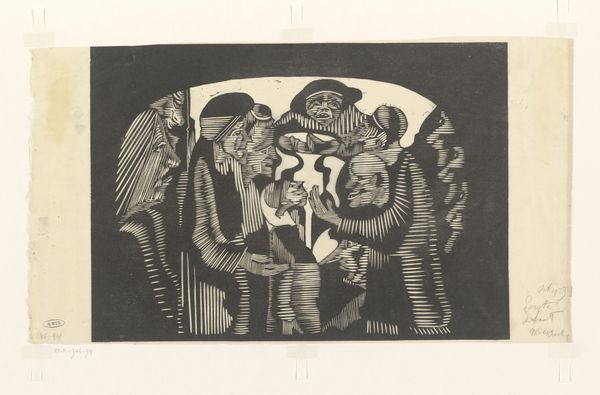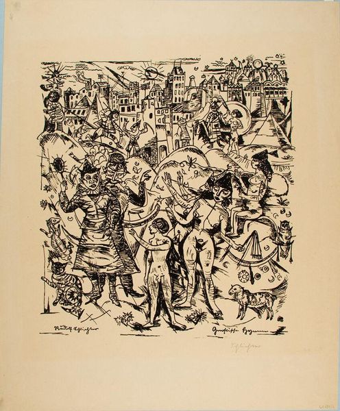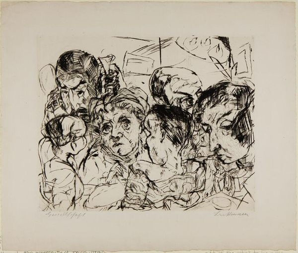 Curator: This is Max Beckmann’s “Behind the Wings of the Stage.” Beckmann, born in 1884, offers us a glimpse behind the curtain. Editor: It feels like a chaotic glimpse! So many figures crammed into this space, all rendered in these sharp, angular lines. It's claustrophobic, almost unsettling. Curator: Yes, and that tension is key. Beckmann often explored themes of social disruption and psychological unease, reflecting the anxieties of his time. Editor: Absolutely. The figures—are they performers?—seem trapped. The stark black and white adds to the sense of alienation, a world stripped bare of color and comfort. Is Beckmann suggesting something about the societal roles we perform? Curator: Precisely. The stage becomes a metaphor for societal performance, the masks we wear, the roles we inhabit. Editor: It makes you question who these people truly are behind their costumes. The artist prompts us to dissect the power dynamics at play. Curator: Indeed, it's a stark portrayal of humanity, grappling with identity in a rapidly changing world. Editor: A world where performance and reality blur. That tension is really palpable. Thanks for the illuminating insights. Curator: My pleasure. It is a work that continues to resonate, inviting us to look beyond the surface.