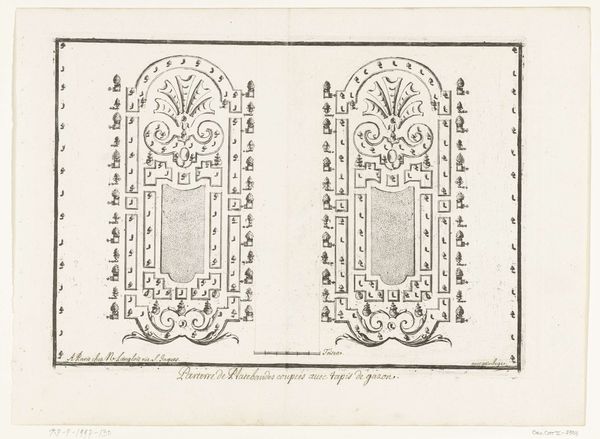 Editor: Here we have André Le Nôtre’s “Parterre met broderiemotieven,” created sometime between 1670 and 1680. It's an ink and pen drawing, quite linear and precise. What strikes me most is the overt symmetry; what do you see in it? Curator: Its symmetry is indeed primary, but I am drawn to the structure underpinning that symmetry. Notice the repeating geometric motifs which constitute a visual language of Baroque order, a controlled vocabulary. It creates a landscape confined. How does that tension strike you? Editor: I hadn't considered the sense of confinement, but the regimented geometric patterns do seem to trap the organic forms, which otherwise are quite wild and florid. Almost a sense of repression through imposed structure? Curator: Precisely. We can consider the Baroque period’s emphasis on both ornamentation and rigid design principles, a dialectic explored here. Consider the very material presence of line in this engraving: how would you read its significance? Editor: It’s a functional drawing so I suppose the emphasis on line helps to distinguish different geometric elements, helping the landscaper interpret the design and implement it with precision? Curator: Yes, but is it only functional? Think of line not just as a boundary but as a declaration of form. The fine ink lines, replicated through the printing process, solidify ephemeral organic matter and turn the soft lines of garden edging into near permanent shapes. Editor: That makes sense; in drawing attention to the lines you suggest we re-examine not only function but meaning. I think that shift in perspective has helped me see it in an entirely new way. Curator: Indeed. Reflecting on structure illuminates the conceptual intention that guided its execution.