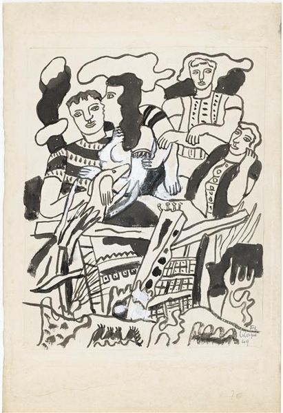 Curator: Alright, let's immerse ourselves in "The album 'Circus'", a work created by Fernand Léger in 1950. Editor: Well, first impressions? It's a riot of lines! An almost frantic energy, yet contained. Like a sketch for something bigger, bolder. A captured moment. Curator: Precisely. Léger here uses ink, prioritizing line and form. Note the sketch-like quality – quick strokes capturing a vibrant group of figures. Editor: And the negative space! It's almost as active as the drawn parts, giving each figure room to breathe, to exist on their own terms despite being crowded together. Curator: It's a hallmark of Léger’s style; that dynamism he finds in seemingly static arrangements. Observe how each figure is defined by strong contours and simple geometric shapes. Editor: You know, I can almost feel the rumble and bustle of a real circus just by looking at this image, like I'm a child all over again. What Léger manages to communicate just with simple lines… it makes you think, doesn’t it? Curator: Absolutely! He aims for a universal expression, simplifying human forms to their most basic elements. The use of stark black ink against the white backdrop enhances that feeling of stripped-down, immediate joy, or playful seriousness. Editor: Yet each form holds so much personality. See that relaxed figure lounging at the bottom right? The others are so upright and proper but that guy seems to have given up entirely, melted in ecstasy and idleness. I mean look how confidently that pose tells us so much. Curator: Exactly, this is pure Léger. It really captures his interest in portraying modern life, finding beauty and harmony within its chaos. There is definitely something circus-like happening here. Editor: So much life packed into a monochrome palette. What a great thing. Curator: Agreed. It reveals how simplicity can lead to profound expression and that maybe, true art is just getting down to that expression in a really meaningful and immediate way.