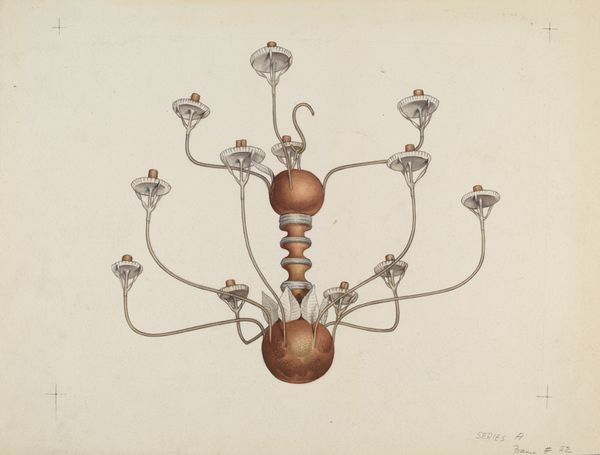Curator: Well, it looks rather precariously balanced, doesn't it? Like a top-heavy hat on a string. I find the pastel color scheme surprisingly muted. Editor: This is Edward Jewett's "Chandelier," a watercolor drawing from 1939. What I see here is more than a depiction of a lighting fixture; it speaks to the symbols of wealth and taste of its era. The chandelier, historically, marks spaces of ceremony and importance. Curator: Yes, the cultural significance is certainly there, but Jewett seems to flatten the form, almost deliberately stripping it of grandiosity. The color choices, particularly the aged paper tone, gives it a retrospective air. Are we looking at a memory? Editor: Perhaps, or an echo of past grandeur viewed through the lens of pre-war anxieties. Think about what a chandelier represents – illumination, enlightenment, but also conspicuous consumption. The oncoming war would surely change the cultural relationship to such objects. There is an almost wistful feeling emanating from the work. Curator: The rendering style does suggest a fragility. There’s a studied clumsiness, almost an intentional naivete in the lines, which conflicts with the refined subject matter. The chains suspending the whole thing look so thin. It makes me wonder what it's all hanging on. Editor: The tension between the delicate presentation and the loaded history of such an ornate object is precisely what I think the image speaks to. Lightness of being confronted with historical and potential social darkness. Also, it presents as a watercolor illustration, suggesting reproducibility and potentially wider accessibility in a time where those notions were actively contested by ideologies that sought to control culture and image. Curator: You're right. Maybe the medium is a symbol in itself, attempting to democratize this traditionally elite symbol. Overall, I find the piece rather haunting; it embodies a peculiar tension of pre-war elegance. Editor: For me, Jewett's "Chandelier" exemplifies a potent intersection of social critique and formal beauty, making it much more than just a pretty picture.