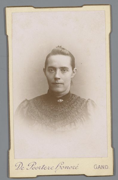 Curator: Look at this photographic print; it is entitled "Portret van een onbekende vrouw". It's thought to have been produced between 1890 and 1902 by Georges Raynaud using a combination of gelatin-silver and albumen print techniques. Editor: Ah, the old sepia tint gives it such a sweetly sorrowful air, doesn't it? There's something almost Victorian-novel melancholy about her gaze, despite its formal pose. And the pearls! They cascade like frozen tears. Curator: Well, studio portraiture of this period served very specific social functions. These portraits were commodities—circulated among family, used for social promotion, or even exchanged as calling cards among the upper classes. They had to conform to expectations of respectability. Editor: You can almost hear the rustle of her elaborate gown! I am mesmerized by the depth in the layers of that elaborate beaded design that circles around her dress, so much handwork; It feels weighty. What an interesting contrast with the sort of lightness expressed in the softness of her hair! I'd love to paint that texture; her dress provides drama, and her head offers gentle grace. Curator: Indeed. Think of the sitter, consciously choosing an outfit appropriate for photographic immortality. This speaks to the democratizing impulse of photography; it becomes a technology available to the wider public, in contrast to painted portraits for the elite. Editor: True, she wants to project some degree of wealth and elegance but nothing ostentatious... I think. I get the sense of a solid, well-intentioned character there, gazing calmly at the camera lens. A face filled with light and love, despite the stern and cold presentation required of the era, as you mentioned before. Curator: Right. Though Raynaud’s studio was located in Anvers, he may not have always been shooting just for locals; international visitors might have sought such portraits as souvenirs. Editor: Thinking about what we just said, that sense of stillness becomes even more intriguing. I leave with a lingering feeling of peace and curiosity, wondering who she was and all she went through! Curator: And, perhaps most importantly, we're reminded how images mediate our encounters with the past. Even the anonymous ones still manage to whisper stories if we only lend them an ear, right?