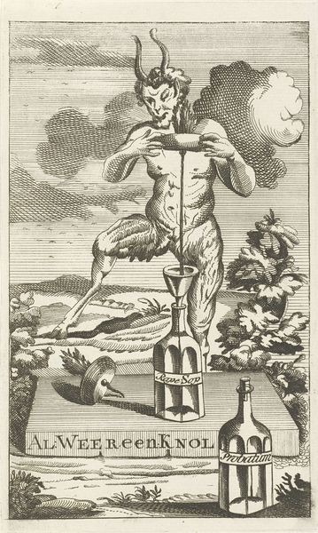 This engraving, titled "Lucht" and created by an anonymous artist, presents a dynamic and intriguing composition. The monochromatic palette and intricate linework immediately draw the eye, creating a sense of depth and movement. The central figure, seemingly suspended amidst clouds and birds, dominates the frame. The artist's use of hatching and cross-hatching defines form and texture, giving the figure a sculptural quality. This is juxtaposed with the more loosely defined clouds, creating a contrast between the solid and the ethereal. The figure's stance and gestures, along with the surrounding elements, could be interpreted through a semiotic lens. The birds, the clouds, and the figure itself function as signs, potentially representing freedom, transcendence, or the element of air itself. These symbols engage with broader cultural codes around natural philosophy. The composition and artistic interpretation invite ongoing dialogue, as the symbolic use of visual elements leaves room for continuous interpretation.