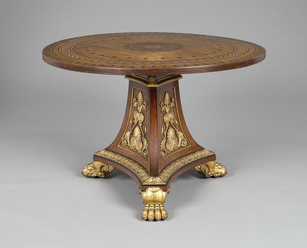 Curator: Welcome. Before us stands a remarkable Pier Table, crafted between 1815 and 1819 by Charles-Honoré Lannuier. This stunning piece resides here at the Metropolitan Museum of Art. Editor: My first impression is its bold synthesis of luxury and mythology. Those gilded sphinxes supporting a marble tabletop make a powerful statement. It’s impossible not to see it as a symbol of power and status. Curator: Absolutely. The use of costly materials—wood, marble, and metal—signals wealth, and the Neoclassical design reflects the aspirations of the emerging American elite in the early 19th century. Lannuier, as a French émigré, understood how to cater to this new class seeking to emulate European grandeur, imbuing their surroundings with signifiers of sophistication and authority. Editor: I’m particularly drawn to those sphinxes. They seem to embody a complex duality—the alluring, almost seductive female form combined with the power of a lion. How does this melding of genders and species play into the table’s broader symbolic language? Is it simply ornamental, or is there a deeper commentary on the shifting roles and perceptions of women in that period? Curator: That's a astute observation. It is likely these sphinxes represent idealized femininity through a lens of imperial ambition. Think of them as silent witnesses to a society grappling with evolving gender roles amidst rapid political and social change. Lannuier and his patrons were undeniably making a declaration. Editor: The very placement of such an imposing object – typically against a wall, beneath a mirror – speaks to performative identity. This table isn't just furniture, but a prop in a carefully curated display of wealth and taste meant to be observed, judged, and envied. Curator: I concur entirely. Considering its existence within elite domestic spaces reveals how art functioned as a marker of social distinction and cultural capital. Editor: This Lannuier pier table isn't merely a beautiful object, but a rich nexus of social, political, and aesthetic currents that invites a deeper investigation into the past. Curator: Precisely, by situating this within the tapestry of history, it challenges us to reevaluate how art helps create both personal and collective identity.