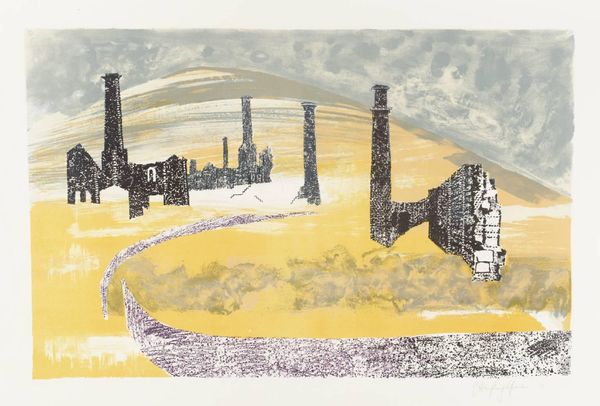 Curator: This is John Piper's "Chambord," held in the Tate collections, the dimensions of the image being 498 by 686 millimeters. Editor: It's strikingly spectral, a gothic silhouette against a bruised, twilight sky. The materiality seems almost ephemeral. Curator: Indeed, Piper often employed a romantic, even theatrical sensibility, here focusing on the structural dynamics of light and shadow. Note how the composition guides the eye. Editor: And the process! I wonder about the application of these washes and inks—likely swift, gestural, capturing the essence of the place rather than a precise likeness. Curator: The subject's monumentality is undeniable, but the treatment subverts a purely representational reading. Editor: Agreed. One thinks about the historical labor invested in Chambord's construction versus the artist's hand in rapidly conjuring its image. Both are acts of making. Curator: Precisely, inviting contemplation beyond mere visual recognition. Editor: A powerful testament to how process and form can transform perception.