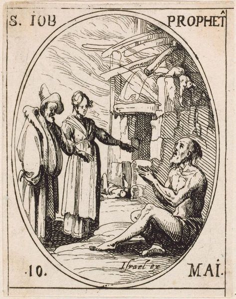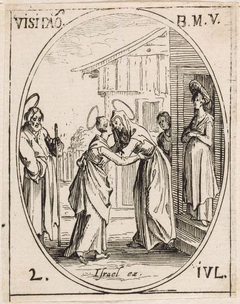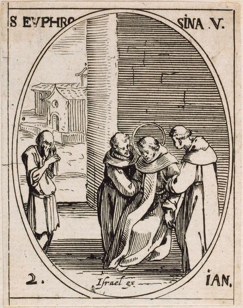 Editor: This small etching, "Saint Petronilla" by Jacques Callot, has such a delicate, almost dreamlike quality. The saint looks so peaceful. What meaning do you find in this image? Curator: Consider the oval frame, a symbol of wholeness and eternity. Within it, we see Petronilla receiving viaticum. The act itself represents a final communion, a preparation for passage. What emotions does the artist evoke through that ritual? Editor: It feels very somber, but also somehow serene. The saint seems ready. Curator: Indeed. And observe the figures attending her. They carry candles and administer last rites. Each element serves as a visual mnemonic, reminding viewers of mortality and the promise of spiritual solace. Editor: I never considered the objects as symbols of cultural memory. Thanks, that's helpful. Curator: My pleasure. It's through recognizing these visual cues that we unlock the deeper narrative.