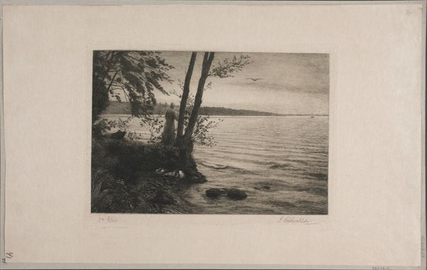 This print of 'Gezicht op de Baai van Garavent bij Menton' was created by Neurdein Frères. Upon viewing this photograph, we're struck by how Neurdein Frères frame Menton. The image presents a tripartite division: vegetation in the immediate foreground, the bay in the middle ground, and the town nestled against the hills in the distance. This structure creates a sense of depth and invites the viewer to explore the receding layers of the composition. The positioning of foliage and branches not only frames the view, but also emphasizes the constructed nature of the image. It's as if the artists are inviting us to consider how we perceive and represent landscape. This framing operates as a sign, directing our gaze and shaping our understanding of the scene. Consider how the tonal range, from the dark foreground to the bright sky, affects our reading of the image. This photograph is not just a recording of a place; it’s an invitation to contemplate the act of seeing itself, and the ways in which we construct meaning through images.