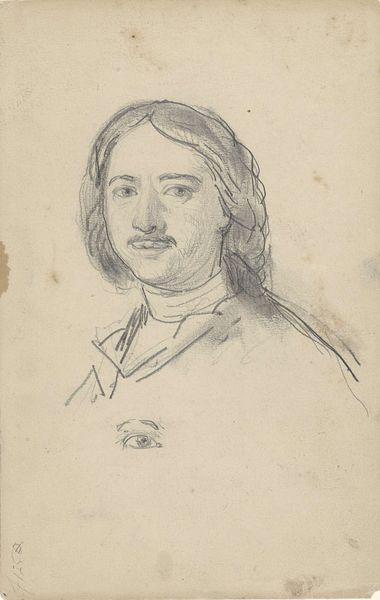 This small drawing depicts Johan Janssens and was likely made by himself in the early to mid-19th century. It offers us a glimpse into the cultural world of artistic self-representation at that time. The image is striking for its informal, almost casual style. Janssens presents himself with a certain romantic flair, his gaze direct but relaxed, which was a typical trait of many self-portraits of that period. It’s rendered with a sketch-like quality that captures the immediacy of the artist’s perception, while also hinting at a degree of self-awareness. The fashion of the sitter is also indicative of his time. To fully understand this work, we would need to delve into the history of portraiture, the rise of the artist as a cultural figure, and the specific social dynamics of artistic circles in 19th-century Europe. By exploring archival materials, exhibition records, and contemporary writings, we can gain insight into its meaning and significance.
