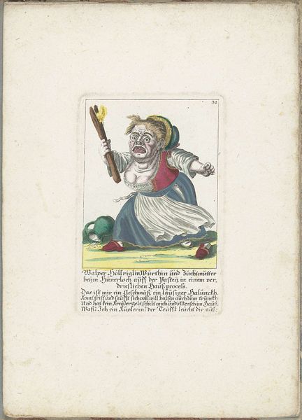 Editor: This is "De dwerg Gertraud Knörtzlin, ca. 1710," or "The dwarf Gertraud Knörtzlin," from around 1710, by Martin Engelbrecht. It looks to be a print, possibly with watercolor. The figure of Gertraud seems quite imposing despite her size. What strikes you about this piece? Curator: It's fascinating to consider this print through the lens of material culture and social context. Prints, unlike unique paintings, were reproducible, thus influencing widespread dissemination of images and ideas. This watercolor element elevates it, yet doesn’t hide its means of reproduction. Editor: How so? Curator: Look at the detail. Is it refined or hasty? The labor put into prints, even with added color, was markedly different than singular painted commissions. Who was the intended audience and how did the print trade shape perceptions of individuals like Gertraud? Were these images made for science, satire, or entertainment? The text below definitely changes things... Editor: I see what you mean. It raises questions about the artist's and the audience's attitude towards the subject. I’d originally just viewed her in isolation as the central character, but in that environment the print's value changes a little. Curator: Exactly. This image acts as a reminder of how production shapes meaning and perception. By questioning the consumption of such images, we start to see the complexities embedded within seemingly simple materials. Editor: So, looking beyond just the image itself but to the process involved, gives us much more of a social history? Curator: Precisely. The artwork's inherent construction opens many opportunities for exploration beyond the immediate depiction. We now understand how Engelbrecht could be responding to social constructs, labor models and the burgeoning market for popular imagery at that time. It’s made me rethink the power structures inherent in portraiture.