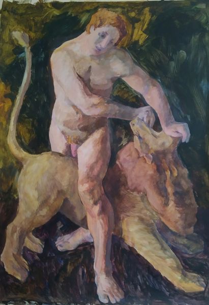 Editor: This is an intriguing piece, an Untitled oil painting by Alexander Roitburd from 2007. The texture is quite thick, almost sculptural, and the figure...well, the figure is presented in a very unusual, almost confrontational pose. What do you see in this work? Curator: I see a raw, almost primal energy. Roitburd has presented us with a body stripped bare, both literally and perhaps psychologically. Consider the symbol of the upended body – what does it signify? What cultural narratives are being evoked, subverted, or even challenged through this particular rendering? Editor: It definitely feels very vulnerable. Is there a connection between the impasto technique and that feeling of rawness? Curator: Precisely. The thick paint acts as a skin itself, a sort of exposed epidermis, emphasizing tactility and the corporeal experience. Note the darkness surrounding the figure – it isolates and amplifies the intensity of the embodied form. Does the lack of a clear narrative amplify or diminish the symbolism at play here, in your opinion? Editor: I think it amplifies it. It forces you to confront the image without a specific story to guide you. Curator: Indeed. Consider how this unflinching gaze connects to a history of the nude in art, particularly concerning themes of sexuality and power. Where do we locate ourselves as viewers of this unsettling image? Editor: This has given me a lot to consider about how artists can use the body to express complicated and intense emotions. Curator: And that the symbols surrounding the human body continue to resonate with different emotional and cultural meaning.