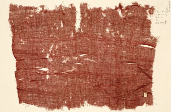 Editor: This striking piece is entitled "Fragment of a Ship Flag," dating back to somewhere between 1630 and 1707. It's made with textile, ink, paper, and appears to be a print, drawing. What really strikes me is the overwhelming texture and the apparent wear and tear. What can you tell me about this piece? Curator: Look at the way the artist has chosen these specific materials. Textile, paper, and ink were readily available in seafaring communities. Its creation would have involved practical skills of printing, dyeing, sewing, each step bearing witness to the maritime industry. It begs the question, what kind of labor went into producing a ship flag at this time? Editor: That's interesting! It suggests this flag wasn’t just decorative; it embodies the work, the effort… Almost like the flag *is* the work itself. Do you think its distressed look is intentional or simply age? Curator: Its ‘worn’ aesthetic invites contemplation on the physical realities of seafaring life. The disintegration of the material acts as a potent metaphor for the toll taken on both ships and their crews by the sea. This deliberate embrace of “wear” as part of the flag's aesthetic suggests a commentary on maritime labor conditions of that time. Could this possibly point to hidden or erased labor histories within trade? Editor: So, we're not just looking at a flag, but a record of labor, trade, and the harsh realities of life at sea… something more than just a symbol of national pride or corporate endeavor. Curator: Precisely. Its artistic value lies in its ability to tell stories, challenging our preconceived notions of nationalistic symbols and forcing a material understanding of labour and industry. Editor: I’ll definitely look at textiles differently from now on! Thanks for making me see it in a completely new light.