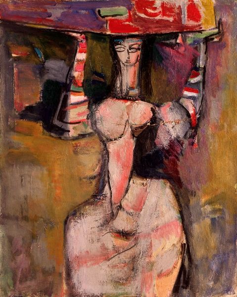 Curator: Alexander Bogen's 1949 oil on canvas work, "The Expulsion," presents a stark and emotionally charged figuration. Editor: The somber color palette and distorted forms immediately evoke feelings of displacement and loss. It's quite arresting. Curator: Bogen's application of paint in "The Expulsion" is notable. Notice the thick impasto in areas, especially around the central figure's garments, contrasts sharply with the thinly veiled background. This textural variance creates a compelling dynamic within the composition. Editor: It's impossible not to consider the broader implications of the word "expulsion." Considering Bogen's experiences during the Holocaust and his postwar commitment to representing Jewish suffering, this work surely grapples with themes of forced migration, trauma, and the search for refuge and dignity. It's a testament to the experience of being forced from home. Curator: Yes, I see how your contextual understanding provides insight here. Structurally, Bogen has deliberately placed the shrouded figure slightly off-center. This placement destabilizes the composition, and I might argue reflects a more broadly unsettling psychological space, drawing us in. Editor: It could also suggest the experience of trauma that violently pushes people to the edges of society and consciousness. This piece really pushes us to remember these displacements of people still occuring throughout the globe. Curator: Ultimately, Bogen invites us to engage with formal and technical methods as active modes of storytelling here. Editor: Absolutely. It pushes us to consider the lasting impacts of trauma and displacement, making "The Expulsion" a really powerful reminder of resilience and struggle in the face of unspeakable loss.