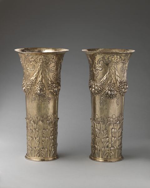 Editor: So, these are a Pair of Wine Coolers, crafted in 1873 by Tiffany and Company. They're silver, and the relief carving is just stunning. The first impression I get is one of restrained opulence. What do you make of them? Curator: Opulence is certainly a key element. Consider how these objects, these symbols of status, echo classical forms and motifs, figures of deities perhaps. What emotional or cultural association might these figures evoke for someone in 1873? Editor: Well, given the Neoclassical style, maybe a sense of refined taste, a connection to the grandeur of the past? Something almost aspirational, as if owning these elevates you? Curator: Exactly. The designers consciously invoke a past perceived as harmonious, balanced. Notice the handles, how they suggest ancient boats bearing floral offerings to the gods, subtly merging abundance and divinity. Are those faces beneath intended to ward off evil, or simply add another layer of symbolic weight? Editor: I hadn’t considered that, but the faces definitely give a sense of something beyond pure decoration. Almost a latent power, especially since there are two of them! Is that deliberate mirroring? Curator: Possibly. Repetition emphasizes significance, visually reinforcing its meaning within the cultural context. The mirror creates symmetry which in turns creates stability, something those purchasing silverware for status were certainly after in that period. It all adds to the sense of controlled grandeur. Editor: I never really thought about wine coolers carrying so much cultural information! I see these now not just as fancy tableware, but almost as cultural time capsules. Thanks! Curator: Indeed. The symbolism is there, just waiting to be decoded. And sometimes the most surprising symbols are on everyday objects.