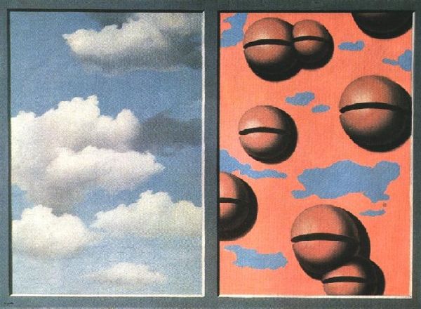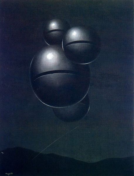 René Magritte made "The voice of space" in oil on canvas, and what strikes me is that he’s taken his time to blend the colours and give the spheres a realistic sense of volume. They seem to glow, with a sort of internal light. The material quality of this painting is all about smoothness. The surfaces are sleek, almost like polished metal, except for the landscape which is quite soft and hazy. Look at the black lines slicing through each sphere; they are so precise, adding a touch of unease to the whole scene. It is like a zipper mouth, unable to speak. I feel like the longer you look, the more the image feels strange and unknowable. I am reminded of Giorgio de Chirico, who explored similar dreamscapes in his paintings, creating a world that feels both familiar and deeply unsettling. Magritte and de Chirico leave space for ambiguity, inviting us to lose ourselves in the mystery.