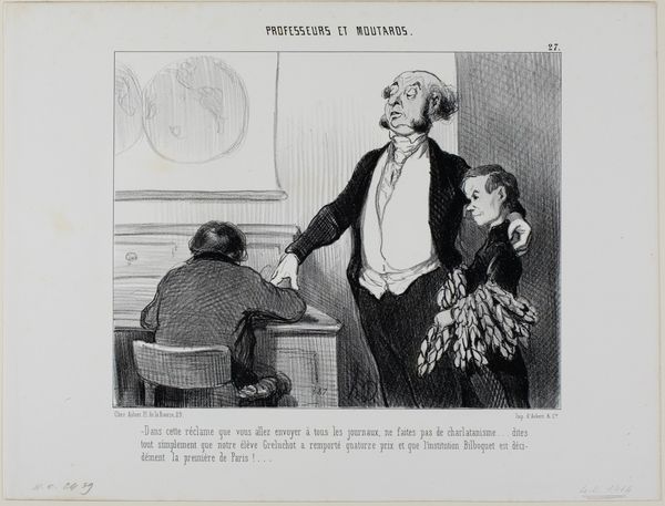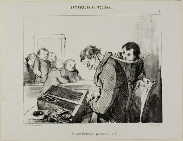 Here we see a lithograph by Honoré Daumier, made as plate 11 from Professeurs Et Moutards, now at the Art Institute of Chicago. The scene is dominated by stark contrasts and exaggerated forms. Daumier's use of line—dense and frantic—creates a sense of chaotic energy within the confined classroom space. Notice how the caricature-like features of the figures, especially the teacher with his bulging eyes and the defiant student, are rendered. This distortion destabilizes the traditional power dynamic between educator and pupil. The composition divides the space into zones of tension: the foreground confrontation versus the background observation of the other students. Daumier uses the lithographic medium to create a visual language that questions the rigid social structures of his time. By subverting our expectations of order and discipline, the artwork becomes a commentary on authority. Consider the artist's strategic arrangement of shapes and lines and how they form a semiotic system that invites us to challenge the very idea of fixed roles and meanings within society.