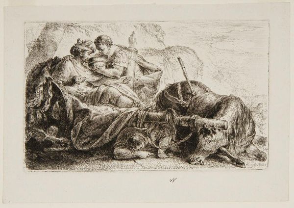 Editor: This is "Two Dogs Fighting" by Friedrich Anton Wolff. It's a pretty intense image, with so much energy captured in the etching. The detail is incredible! What can you tell me about it? Curator: Note the stark contrast created by the etching process, highlighting the labor involved in producing this image. The artist's choice of subject – domestic animals in conflict – perhaps reflects the social anxieties of the time. Consider how the means of production influence our understanding of the artwork's message and its place within a broader cultural narrative. How does it challenge traditional notions of art? Editor: That's interesting, I hadn't considered the social context and how the process itself informs the meaning. Thanks! Curator: It's been a pleasure discussing how production shapes perception.