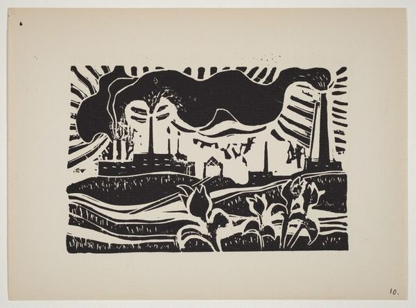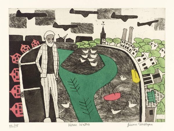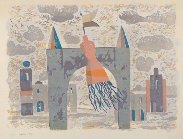 Editor: This is Julian Trevelyan’s “Outside Kampala,” date unknown, held at the Tate. It’s quite striking with its bold colors and flattened perspective. The figures seem both present and like symbolic stand-ins. What do you see in this piece? Curator: The symbolism here intrigues me. Consider the stacked barrels – potent symbols of storage, containment, perhaps even suppressed potential. They loom over the scene, almost like watchful eyes. Does the bicycle suggest a striving for progress? Editor: That's a really interesting idea. The bicycle could represent movement and ambition. Curator: Indeed. And how does the artist use color to evoke emotion and cultural memory? The ochre sky, the earthy tones... These choices aren't arbitrary. Editor: I see what you mean. It feels warmer and more connected to the land than if it were, say, a cool blue. Thanks for pointing that out! Curator: My pleasure. It’s about unlocking the visual language embedded within the artwork.