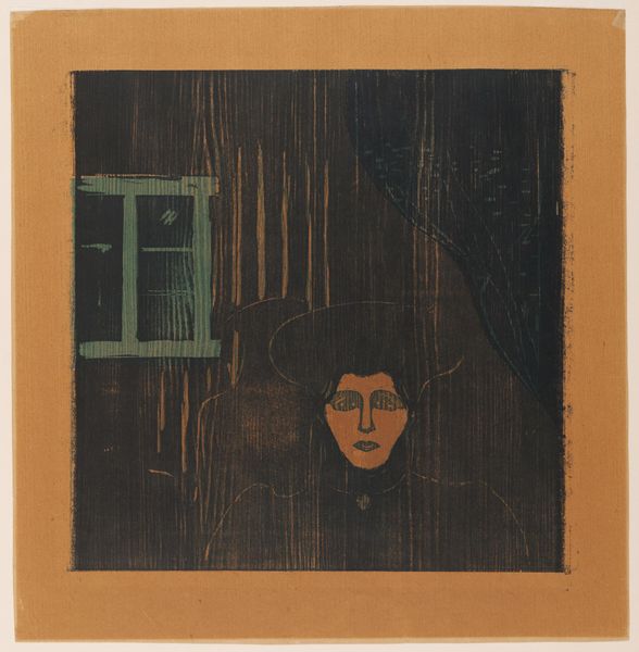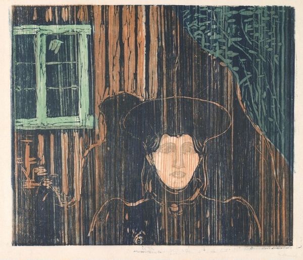 Editor: This is Edvard Munch's "Moonlight I", a print from the Harvard Art Museums. The somber tones and woodgrain give it an almost oppressive feel. What strikes you about this piece? Curator: The woodcut medium is critical here. Look at how the labor-intensive process of carving the woodblock itself becomes part of the visual language, mirroring the rough-hewn architecture and the subject’s somber mood. How might the printmaking process have influenced Munch’s artistic choices here? Editor: So, the physical act of creation is as important as the image itself? I never thought about it like that before. Curator: Precisely. The materiality speaks to the social and economic conditions of art production at the time. Considering that can really open up our understanding. Editor: That’s fascinating! I'll definitely look at art differently now.