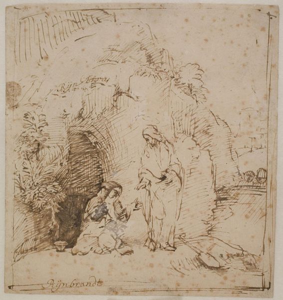 Editor: This pencil drawing on paper is titled "Children with a Dancing Bear." It was created by Wilhelm Amandus Beer and now lives at the Städel Museum. I’m struck by the sketchiness, a little haunting but also kind of whimsical. What do you see in this piece? Curator: Well, right away, the dancing bear leaps out. Consider the historical context; traveling entertainers with dancing bears were a fairly common sight in Europe for centuries. What emotional register does that strike for you, considering it alongside children? Editor: It feels complicated. There’s something almost cruel about the performing animal. But the children look mostly amused, or at least curious. I guess it speaks to a past when we interacted with animals very differently? Curator: Exactly! The bear, a symbol of untamed nature, is rendered docile, almost human. What do you make of the chains? Editor: They remind us the bear isn't really free. And I suppose they also emphasize the power dynamic – who is in control, and who is being controlled. The artist uses them so subtly that they also seem as if they could be skipped over without a thought. Curator: That’s insightful. Bear imagery is rich and can also signify strength and courage, even healing. Here, the forced performance clashes with that inherent wildness, generating a powerful tension. The artist invites a consideration of not only this performance, but humanity's relationship with nature. Are we honoring nature’s symbolism or suppressing it? Editor: So, beyond just a snapshot of a time gone by, it's more like a coded message about how we, as humans, exert influence on the natural world? I’ll certainly be thinking more about those dancing bear stories I come across in folk tales. Curator: Indeed. The layers of cultural meaning embedded in a simple sketch can be quite profound.