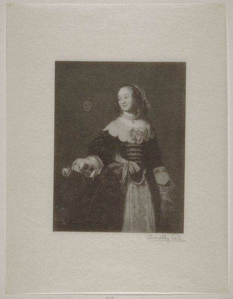 Editor: So this is Timothy Cole's "La Finette" from 1916, a wood engraving print. It has a classical, almost romantic feel to it, and the dress almost steals the show. How do you interpret this work, considering its historical context? Curator: Seeing "La Finette," I immediately think about the socio-political landscape in 1916. World War I was raging, yet here is this incredibly delicate portrait of a woman, seemingly removed from the turmoil. Does the emphasis on beauty, as expressed through the elaborate dress and refined pose, represent a form of escapism? Or perhaps even resistance, a quiet assertion of grace and humanity in the face of brutality? Editor: That’s interesting, the resistance idea. I hadn't considered that angle, I was more focused on how the print medium democratized art… Curator: Exactly, the wood engraving technique itself is crucial. Prints made art accessible. Who could afford an oil painting, right? Now think about the depicted woman: how does her attire communicate status, but also perhaps the expectations placed upon women of that era? Is there something about her demure pose that challenges, or reinforces, traditional gender roles? Editor: Hmm, she does seem a little reserved, almost passively elegant... it does bring to mind those limited roles women were expected to play back then. I wonder what “La Finette” means. Curator: “La Finette” can loosely translate to a stylish or fashionable woman. In this context, we can question how Cole situates her—a society woman during a global conflict. I am curious, does Cole challenge or solidify expectations? And how might the distribution of this print challenge hierarchies? Editor: I never really thought about portraits being used in that way. Thanks, I definitely have a broader view now. Curator: The intersection of art, war, gender, and class... it's a potent combination to consider when viewing a piece like this. It enriches the dialogue.