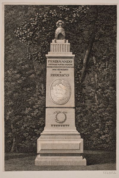 Curator: It strikes me as powerfully restrained. An engraved print, mostly in blacks and whites, rendering a monument. It feels…solemn. Editor: This is "Peder Skram," an engraving and etching crafted between 1779 and 1781 by J.F. Clemens. Currently residing here at the SMK, it presents a distinct example of Neoclassical aesthetics employed in landscape—although it’s less landscape and more "memorial-scape." Curator: Precisely! The symbolism is layered: a pillar topped with what appear to be cannonballs, then the engraved name "Peder Skram", underneath a laurel wreath intertwined with what appears to be a ribbon, with a sheathed sword placed beneath it.. The sword feels less like a celebration of war and more like a symbol of duty fulfilled and then laid to rest. The wreath signifies honor, no doubt. But the overall feeling is subdued, as though this were a private memorial despite its grand architectural style. Editor: That reading aligns quite well with the Neoclassical penchant for virtue and civic duty. Skram was, indeed, a renowned naval hero. The engraving presents him not through dramatic portraiture, but instead through stoic, symbolic representation of a memorial. The artistic decision speaks volumes about how societal heroes were presented at that moment in history. Less about personal glory, more about the ideals they represented. Curator: Do you think there's an element of collective grief intertwined, especially if we place it in the socio-political atmosphere of its time? Monuments are not only for the hero, but also, perhaps even moreso, for the survivors, the ones who remain and carry forth the cultural implications and weight. Editor: A poignant consideration. Engravings, distributed as prints, became vehicles for disseminating such national narratives. The image allowed widespread participation in constructing shared memory of heroism. Skram wasn't just a person; his image, mediated through art, was leveraged to reinforce particular values. It highlights art’s important role in nation-building and memorializing individuals through a refined and almost solemn filter. Curator: It's far more profound than just a landscape, then; it encapsulates an era's perception of honor and remembrance and it reminds us how symbols continue carrying multiple messages through generations. Editor: Precisely, It provides an artistic insight into understanding the shaping of history and its key figures to be studied to this very day.