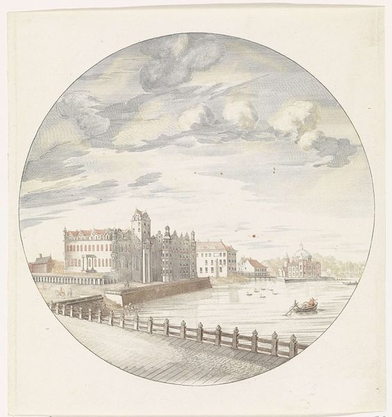 This is Jan van Call's rendering of the Berlin City Palace, made around the late 17th century using pen and watercolor. Enclosed within a circle, the image conveys a panoramic view of the palace and its surroundings. The composition hinges on the stark contrast between the architectural precision of the palace on the left and the open, airy expanse of the plaza to the right. Call’s manipulation of perspective subtly flattens the depth of field, drawing our attention to the surface, and emphasizing the artwork as a constructed image. Notice how the architectural elements are delineated with careful linework, juxtaposed against the fluid washes of color in the sky and ground. This interplay between line and color might be interpreted through the lens of semiotics, where the palace symbolizes power and order, while the open space suggests possibility. Yet, the flattening of perspective challenges traditional notions of depth, hinting at a destabilization of established hierarchies. This tension between representation and abstraction invites us to question the very nature of perception.