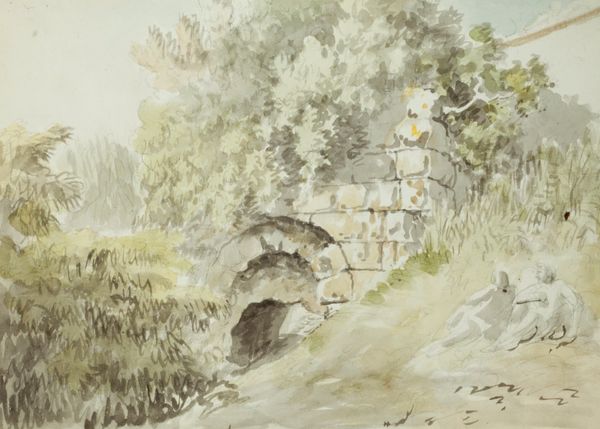 Curator: "Berglandschap met water bij Glion," or "Mountain Landscape with Water near Glion," a watercolor from Anna Catharina Maria van Eeghen, likely created between 1888 and 1901. What are your first impressions? Editor: A very understated scene, wouldn't you say? Muted greens and blues. It makes me think about the physicality of watercolor and how effortlessly she seems to manipulate the watery medium on paper. Curator: Van Eeghen moved within artistic circles that championed 'plein-air' painting. How might painting outdoors have influenced the way she represented the landscape? Editor: Being on-site is pivotal to my understanding of the piece. Note the speed and economy of the marks! She uses quick brushstrokes to capture the light reflecting off the water and the textures of the rocks and foliage, embracing its fleeting nature. Watercolor must have presented some real challenges when dealing with environmental conditions on site. Curator: I agree, there's a freshness that can only come from direct observation, wouldn't you say? Landscapes during the Impressionist period also played an interesting role in the burgeoning tourism industry and growing middle class. Editor: Tourism! That’s a thought, yes. Maybe that partly explains why a work like this could emerge at that particular time? The democratizing potential of watercolors also appeals; portable, readily available materials meant landscape painting didn't necessarily need to be an elitist pursuit. Curator: Very insightful! While artists certainly had a variety of motivations, these works still played a role in constructing perceptions of particular places and lifestyles. It makes you think of the art market itself— who was buying these paintings, and how they were being used or displayed? Editor: That’s an angle I had not previously considered, although you're making me think a great deal about class and artistic production. Looking again at the quick brushwork I feel there is a kind of labor encoded in that handling of materials; maybe there are elements of production here that suggest it was for the artist’s use, and not consumption per se. Curator: True. By investigating paintings like Van Eeghen’s, we start to understand how the role of art history can inform what was valued, why, and who had the power to define artistic importance. Editor: Well, my emphasis would always be on how its made and whether its materials have influenced my viewing of it.