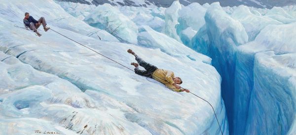 Curator: Mark Beck's striking painting, titled "There Goes the Neighborhood," presents us with a truly unsettling image. Editor: Unsettling is right! The scene is so vividly turbulent; I feel an immediate sense of precariousness and impending doom. That single house poised at the edge… it’s terrifying! Curator: Indeed. Beck's composition, painted with thick strokes of oil paint in a Neo-Expressionist style, portrays a solitary house cascading over the edge of what appears to be a massive waterfall. Editor: Symbolically, it's quite loaded, isn't it? Water, representing cleansing and destruction, meets the house, which so often stands for family, home, and security. The image of a house going over a waterfall—the implications of complete and utter loss—are overwhelming. It evokes societal fears of displacement and dispossession, I'd say. Curator: I think so too. This speaks to larger social narratives. Perhaps the artwork critiques rapid urban development, gentrification, or the destruction of communities through economic and political forces. It certainly fits within the modern-moral subject category. The falls stand as an unflinching force. Editor: Precisely! Consider the potent image of a waterfall throughout art history: it stands for both power and unstoppable natural forces. Beck’s choice feels pointed; it implies something greater is at play here—a societal failing, perhaps? A broken promise of the 'American Dream?' Curator: That’s a valuable insight, especially if you see it in light of Neo-Expressionism and its revival of expressive angst in the late 20th century. It reflects those artists turning to representational and narrative subjects to wrestle with those problems. Editor: Ultimately, "There Goes the Neighborhood" serves as a visual elegy for lost stability and belonging, the visual symbols carry this forward. Curator: A powerful metaphor rendered through potent, if slightly unrefined, brushwork. Editor: Yes, a stark reminder of fragility, even where we expect solidity.