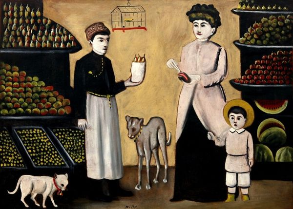 Curator: Welcome. Before us hangs “Fruit Stall” by Niko Pirosmani, currently held in the Niko Pirosmanashvili Museum. The artwork portrays a genre scene within a Georgian shop. Editor: The muted tones immediately struck me. Everything appears painted on a very dark ground. You get this strong sense of how basic the supplies must have been—the paints so thickly applied. Curator: The image conveys so much about the Georgian concept of ‘samaia’, a state of blissful domesticity and plenty. Note how the vendor presents the fruit to the customer, and how her child observes the sale. Editor: Absolutely. There's something quite primal about this marketplace depicted by Pirosmani. I want to delve into the materials he employed; this black oilcloth— where did it come from and how did its prevalence impact artistic expression? Curator: Interesting angle. The artist was a self-taught wanderer. Details, though, often symbolize a more expansive view of Georgian identity and hospitality; the fruit itself, an invitation. Editor: Right, it all centers on consumption, the movement of goods, the labor of cultivation displayed on the seller’s face—the unsmiling faces really make you think. And those dogs, are they symbols, too? Curator: Animals play a significant role in Pirosmani’s paintings. Here they reflect a sort of harmony, almost an Edenic image with humans, animals, and nature coexisting around the promise of sustenance. Editor: It seems like a stretch given that watchful tension among them. This raw directness begs an assessment of the means of its creation. Let’s talk about artistic context; did the materials constrain or liberate him? Curator: The use of industrial oilcloth supports the artwork's symbolism as a record of lived experience within early twentieth-century Georgia, imbuing mundane, simple things with iconic presence. Editor: So, a commentary on material access. These bold, flat compositions are compelling evidence of someone carving a space outside formal academies. Ultimately the piece serves as documentation and artistic expression melded by necessity. Curator: I agree. "Fruit Stall" truly represents the collision of symbolic storytelling and unvarnished materiality. Editor: Yes, a place where the humblest interactions shine with extraordinary historical resonance.