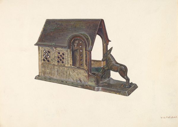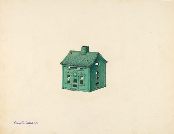 Editor: This is "Toy Bank: Man in a Cabin," made around 1937, using colored pencils and mixed media. The colors feel almost cartoonish, yet the detail on the cabin makes it look realistic. What's your perspective on this curious artwork? Curator: The integration of a functional object – a toy bank – immediately foregrounds the art's connection to the means of production and consumption during the 1930s. The deliberate, almost folk-art style begs the question: Was this created as a prototype, exploring mass-production feasibility, or a handcrafted, singular object that challenges mass consumption? Editor: That's an interesting way to frame it. The attention to details like the tools hanging on the wall makes it seem too artisanal to be a prototype for mass production. Curator: Precisely. And consider the medium itself - mixed media and colored pencil. There’s an element of labor and materiality here that challenges conventional distinctions between "high art" and craft. What kind of social narrative emerges from such a tension? Does it imply a democratization of art, accessible means, or something else? Editor: Maybe a yearning for simpler, more tangible times during the Depression Era? Almost like a pre-industrial sentimentality toward craftsmanship and simpler objects. Curator: Perhaps. We also cannot ignore how it could question modes of art creation and distribution in a quickly industrializing society. The piece could critique mechanized forms, by championing handcrafted objects as art forms worthy of our attention and financial investments represented through toy banks. Editor: I've learned a great deal. Seeing the means of creation really changes how you view it. Thanks for this point of view! Curator: Absolutely, It is crucial to comprehend how process shapes art, prompting us to consider how it impacts culture.
