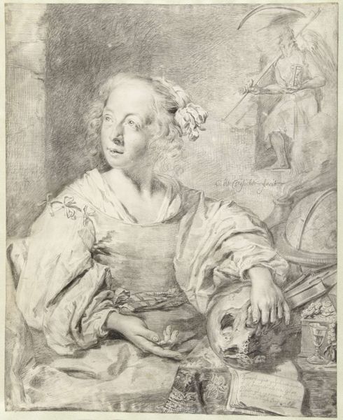Editor: This is Crispijn van de Passe’s engraving, "Persian Sibyl," created around 1615. It's striking how the figure's gaze pulls you in. The Sibyl holds a large book and gazes up to the left where we see a vision of the divine in the clouds. What can you tell me about the imagery in this engraving? Curator: This work operates within a dense network of symbols. The book she holds isn't just any book; it represents knowledge, prophecy. Remember, Sibyls were figures from antiquity, believed to possess prophetic abilities, often connected to specific sacred sites. The inclusion of the vision of the divine suggests a source of her knowledge. What resonates is how this image positions the Sibyl as a vessel of divine wisdom, connecting the viewer to both classical antiquity and a broader, perhaps Christian, understanding of revelation. What emotions do these visual connections stir? Editor: I notice that the Sibyl has a crown of laurel; how should I interpret this symbol? Curator: A laurel wreath carries layers of significance. Its classical association with triumph and victory morphs, in this context, to represent intellectual and spiritual accomplishment. By including this feature, the artist suggests her prophetic pronouncements hold undeniable truth. She transcends temporal authority to convey divine knowledge, a truth communicated through symbolic forms. How does recognizing this interplay of symbols enrich your appreciation of the artwork? Editor: I never really thought about all the possible ways artists could visually imbue these images with layers of interconnected meanings. It makes this piece much richer. Curator: Absolutely! Recognizing this layered communication adds so much to our encounter with historical images.