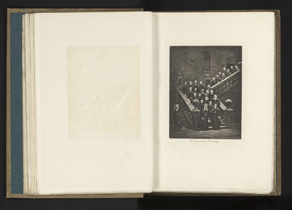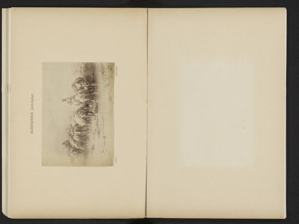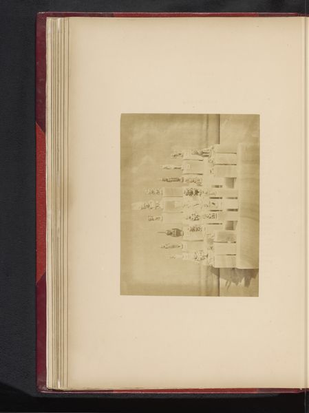 Editor: So, this open book shows an image of what is labeled "Three copper crosses and five copper candlesticks," created before 1896 by Joseph Casier. It feels very staged, and formal, almost like a record. What do you make of it? Curator: This image is particularly interesting when we consider the labor and materials involved in its production and intended use. Copper, in both crosses and candlesticks, wasn’t just a material; it represented an investment of labor in the extraction, smelting, and crafting of it. Consider also the paper; likely homemade, certainly aged, it underscores the investment involved in crafting this image and the potential skill required to create hand-drawn type in its title. Editor: So, you’re saying it’s less about the religious objects themselves, and more about what they’re made *of*, and how? Curator: Precisely. The image itself is secondary to the reality of objects made and reproduced here. The use of photography to document these liturgical objects speaks volumes about the commodification and display of craftsmanship within a particular religious context. Can we see it also as a kind of "inventory?" Who consumed the image and the artifacts portrayed? Editor: That’s fascinating. It's like the photo, the objects, the paper and even the text are all layers of labor. It definitely shifts my perspective on seeing this just as a still life. Curator: Indeed. By emphasizing the material realities, we disrupt traditional art historical narratives that privilege symbolic or aesthetic readings, challenging established ideas of artistry itself, moving towards understanding and contextualization instead.