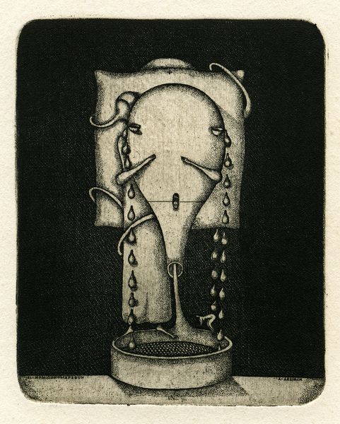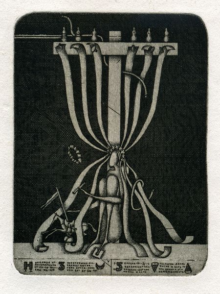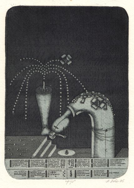 Curator: We're looking at "Pf 1984," a print created in 1983 by Oleksandr Aksinin. Its dense, finely worked lines draw the eye immediately. What's your initial reaction? Editor: An immediate feeling of constraint. The subject is compartmentalized, almost as if the components were mechanically fitted rather than grown organically. I also notice the textures. They almost vibrate. Curator: Considering the date, the title alludes to George Orwell's dystopian novel. Aksinin lived in Soviet Ukraine at the time; "1984" had obvious sociopolitical resonance. The geometric patterns and constructed form might then suggest enforced order and loss of individual expression within a totalitarian system. Editor: Absolutely. The labor-intensive process of engraving further speaks to the oppressive themes—it requires meticulous, almost obsessive mark-making, reinforcing the sense of regulated production and perhaps even social control over the creative spirit. It mirrors state control over the means and mode of cultural expression. Curator: And it also points to the complex nature of identity under oppression. Notice how Aksinin merges human, animal, and geometric forms, questioning clear boundaries, perhaps symbolizing the hybridization of identity and imposed structures. It almost deconstructs the self under duress. Editor: The composition invites further contemplation of these forms; are they acting as components in this peculiar assembly or constrained inhabitants within these demarcated borders? Each element appears both independent and connected to the encompassing form. The legs appear fragile and yet prop the entire system of constraints, implying their potential liberation. Curator: I agree. Its surreal style, which combines graphic and engraving media, is rich for examination and further discourse. It also acts as a symbolic response to lived experience. What began as observation yields nuanced ideas of labor, constraint and material intervention. Editor: For me, focusing on his work helps highlight not only the technical process of engraving but also the human element—his expression and political views during the Soviet Ukrainian period.