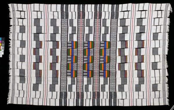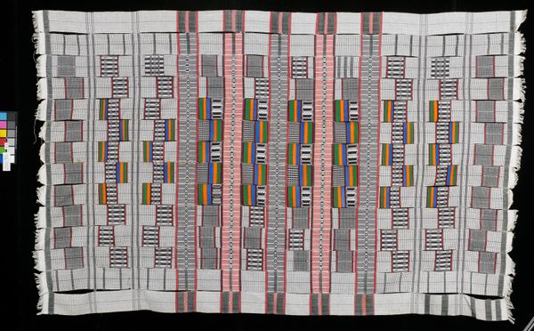 Editor: This “Man’s cloth”, created around the 20th century by an anonymous artist, and residing here at the Minneapolis Institute of Art, presents a striking geometric pattern using cotton textiles. The meticulous weaving feels almost mathematical. What can you tell me about the materiality and process behind a work like this? Curator: This cloth, composed of woven cotton, forces us to consider the means of its production. The act of weaving, historically associated with domestic craft, challenges the conventional separation of ‘high’ art and the everyday object. Editor: So you're saying the labor is central to understanding it? Curator: Absolutely. Think of the process – the sourcing of the cotton, the dyeing, the actual weaving itself. The creation isn't solely an individual artistic expression, but is deeply embedded in social and economic systems. Editor: That's interesting. It looks very repetitive; does the pattern itself have any significance beyond aesthetics? Curator: It could. But what is striking is the textile itself. What does its very being signal? This cloth's survival becomes evidence of a material culture—weaving practices, trade networks, and potentially the ritual or social role it played in its original community. It is an extraordinary act to preserve this practice. How has this weaving challenged your assumptions about art? Editor: I guess I always focused on the final image, not so much on the steps needed to make it a reality. Curator: Precisely. A materialist approach reveals the complex layers of production and consumption intertwined within the aesthetic object. Editor: It really reframes the way I see the finished piece. It’s more than just a pretty pattern, but a result of tangible efforts. Thank you.