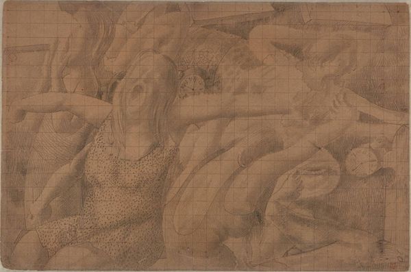 Editor: This is Sir Stanley Spencer’s study for ‘Christ Carrying the Cross’. It looks like a preliminary sketch, and the gridlines give the image a mathematical, almost scientific feel. What strikes you about this piece? Curator: Considering Spencer's WWI experiences, this work is laden with social commentary and the politics of imagery. Notice how the crowd almost overwhelms Christ, becoming the dominant visual force. Does that visual choice reflect something about society's role in such events? Editor: It's interesting to consider the crowd as an active agent rather than a passive backdrop. The political implications add depth. Curator: Indeed. And it prompts us to consider the institutional forces at play, shaping both the historical event and its representation. Food for thought, right? Editor: Definitely. It's a lot more complex than I initially perceived.