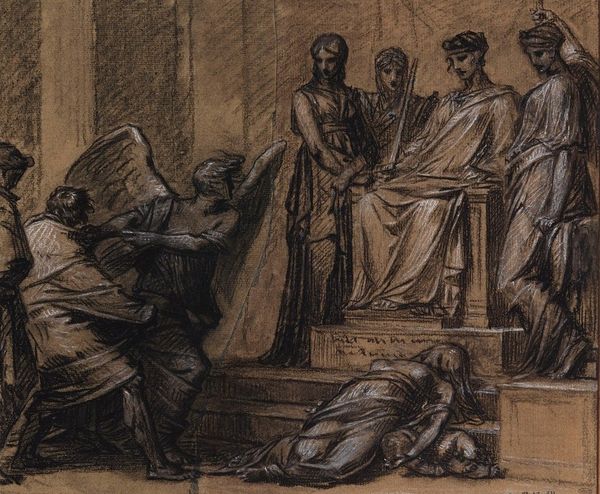 Curator: Oh, what a scene. It feels like twilight, doesn't it? Everything bathed in that hazy, crepuscular light... a moment of profound stillness. Editor: Indeed. We're looking at "The Messenger" by George Frederic Watts, held at the Tate. Notice Watts's masterful use of impasto, creating tangible texture in the figures' robes. The layering of pigment is quite thick. Curator: Yes, and it's not just technique, but feeling... that weary hand reaching out, the ethereal figure holding what appears to be a sleeping child. It whispers of mortality, of transitions. Do you see the violin abandoned on the floor? Editor: I do. Abandoned tools speak volumes, don't they? It's a potent commentary on the role of labor and creativity in the face of… well, the inevitable. What kind of social structures allow an artist to reflect so profoundly on mortality? Curator: Perhaps Watts was pondering the weight of Victorian society itself, all its striving and ambition, set against the grand, indifferent sweep of time. Editor: Or maybe it's about how the very materials of art – the pigments, the canvas – are themselves subject to decay, a constant reminder of impermanence. Curator: It’s a beautiful, melancholy thought to carry with us, isn't it? Editor: Certainly, Watts makes us think deeply about what materials, labor, and time can convey.