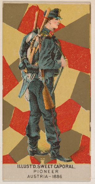 This small lithograph, Matelot, was produced by the Kinney Brothers Tobacco Company, probably in the 1880s. It’s one of a series of cards depicting national dances that were included in cigarette packs. Lithography is a printmaking process that relies on the chemical repulsion of oil and water. The image is drawn on a stone or metal plate with a greasy substance, then treated with acid, allowing ink to adhere only to the drawn areas. This print, like others in the series, would have been produced in large numbers, reflecting a significant investment in industrial production and distribution. The image shows a stylized depiction of a young dancer. His costume is carefully rendered with attention to its texture and detail. These cards were not just about advertising; they also provided a form of cultural education, albeit one filtered through the lens of commercial enterprise and colonialist ideology. By examining the materials and processes involved in its creation, we can understand more about the social and cultural context in which it was produced and consumed.