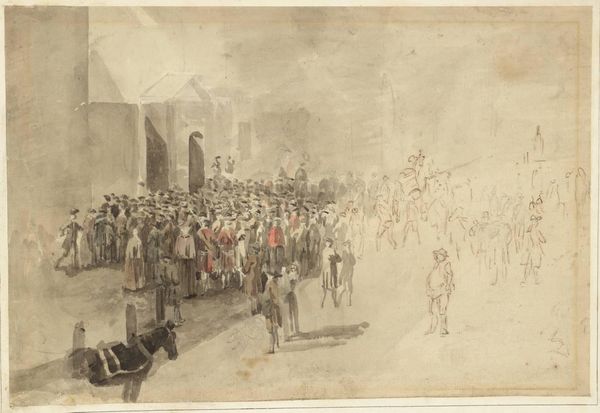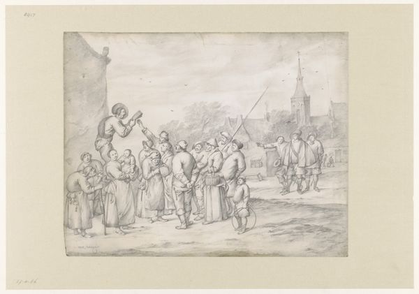 Augustinus Jacobus Bernardus Wouters created this drawing, "Rederijkers delen pamfletten uit," using pencil, depicting a historical scene. The composition is meticulously structured. Wouters uses a receding perspective, drawing the eye from the foreground figures to the background architecture. Notice the detailed rendering of the crowd, their poses and interactions subtly defining the character of the scene. Light and shadow play a crucial role in creating depth and emphasizing the distribution of pamphlets. The church is visible, yet the focus is diverted by the figures. The distribution of pamphlets becomes a pivotal semiotic act. Wouters uses this to challenge established meanings and engage with questions of societal change. The drawing's formalism—its careful composition and detailed execution—reflects a broader artistic and philosophical concern, highlighting the power of representation and its ability to shape cultural discourse.