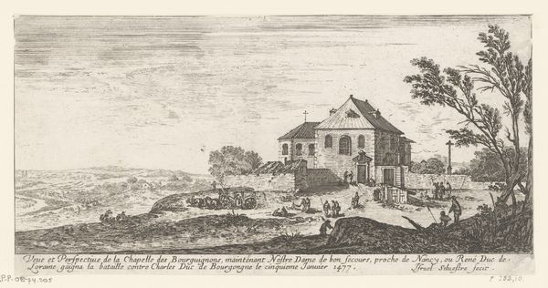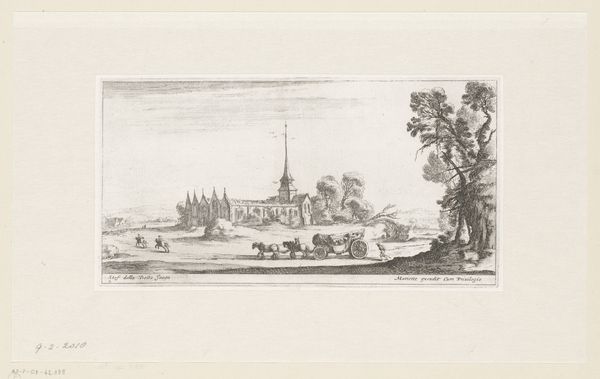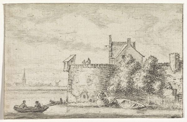 This print, "Gezicht op fort Meulan aan de Seine" was made by Israel Silvestre, likely in the mid-17th century. It is an etching, meaning that the image was created by drawing lines through a waxy ground on a metal plate, then bathing the plate in acid. The acid bites away the exposed metal, leaving recessed lines that hold ink. Look closely and you’ll notice the fineness of the lines, and the amount of work involved in achieving this level of detail. This method allowed Silvestre to create multiple impressions, meaning this image could be widely distributed. Prints like this one satisfy the growing appetite for views and landscapes, reflecting the increasing urbanization of the period. Though seemingly detached, the image is very much tied to economic production. The printmaking trade provided employment and fueled consumption, while also shaping perceptions of the world. It reminds us that even seemingly straightforward images can have a complex relationship to labor, politics, and capitalism.