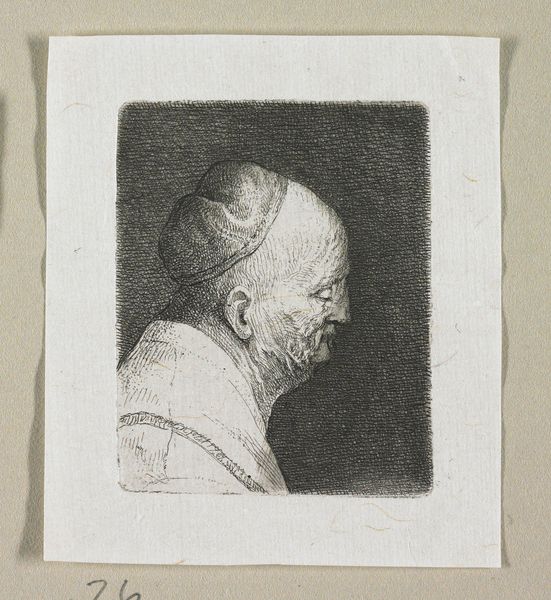 Curator: Let’s consider Giovanni Domenico Tiepolo’s “Man met muts,” created sometime between 1771 and 1774. This is an engraving, a portrait showcasing a man in profile. Editor: My initial impression is the subject has such a weathered look, and a pensive expression that really strikes me, though it’s all achieved through very delicate, almost scribbled lines. The texture is quite remarkable for an engraving. Curator: Absolutely, the fine lines contribute significantly to the portrayal of age and character, and it is not really possible to know whether this man was an actual existing character or a figment of the artist's imagination. During that time, portraits of common people gained some popularity because artists aimed to showcase ordinary lives as significant subjects for art. What really strikes me about it, from that point of view, is that the work almost humanizes people outside aristocratic circles. Editor: It’s curious, isn’t it? The level of detail is almost hyperrealistic; you can see every wrinkle and crease, especially around the eyes and mouth. Technically, it's a masterclass in cross-hatching to build form and volume and use of shadows that brings this face to life from this tiny image, really focusing in a close cropped framing of the person. Curator: It’s precisely this kind of detail that underscores Tiepolo’s mastery. By imbuing commoners with the same artistic attention previously reserved for the elite, artists are now giving prominence to ordinary members of the European populace during that timeframe. Editor: And this work also makes us question the value placed on each portrait and its public visibility, given the technical nature of creating multiple prints compared to commissioned, individual oil paintings, for example. Curator: A compelling observation that speaks volumes about accessibility and audience engagement, perhaps now allowing greater reach within a changing European social landscape, and for us a lens through which we look today at the world of Giovanni Domenico Tiepolo. Editor: Precisely! It highlights how seemingly simple visual choices can hold layered significance about technique and also our broader visual world.