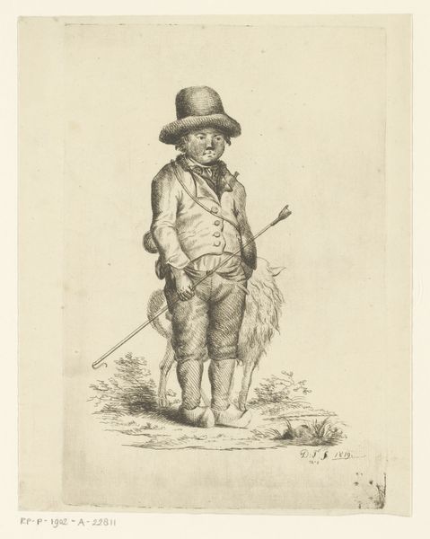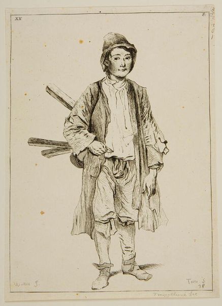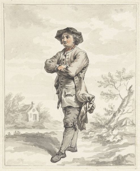 Jacob van Strij created this watercolor and pencil drawing of a seated man with a knapsack and walking stick in 1764. During the 18th century, images of working-class individuals became popular as artists explored themes of labor and everyday life. This drawing offers us a glimpse into the life of a common traveler, perhaps a migrant worker, depicted taking respite on the roadside. Van Strij’s choice to portray his subject in a moment of rest complicates romantic notions of the wandering traveler. We see the physical toll such a life might take. The man's weary posture and the weight of his pack suggest a life of hardship and impermanence. The artwork presents a narrative of perseverance, subtly highlighting the class disparities of the era through the quiet resilience of its subject. It reminds us of the silent stories carried by those on the margins of society.